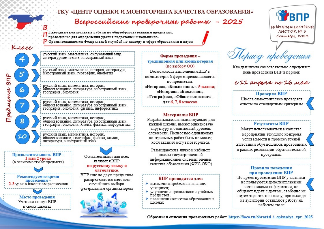 ВПР по учебным предметам в 4 – 8, 10 классах будут проводиться по образцам и описаниям контрольных измерительных материалов 2025 года, представленным на сайте ФГБУ «Федеральный институт оценки качества образования» (https://fioco.ru/obraztsi_i_opisaniya_vpr_2025)