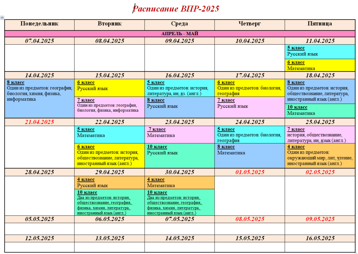 План-график проведения всероссийских проверочных работ в 2025 году
